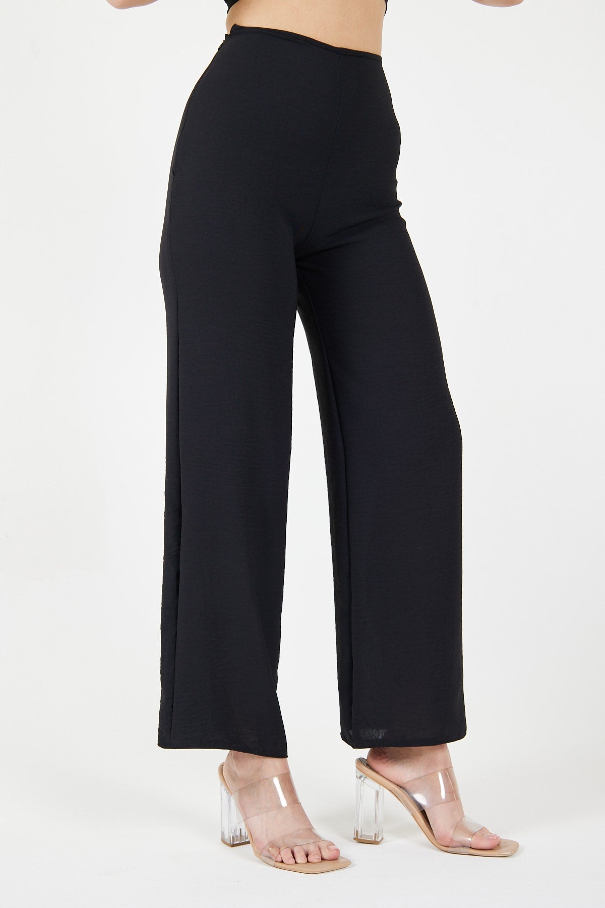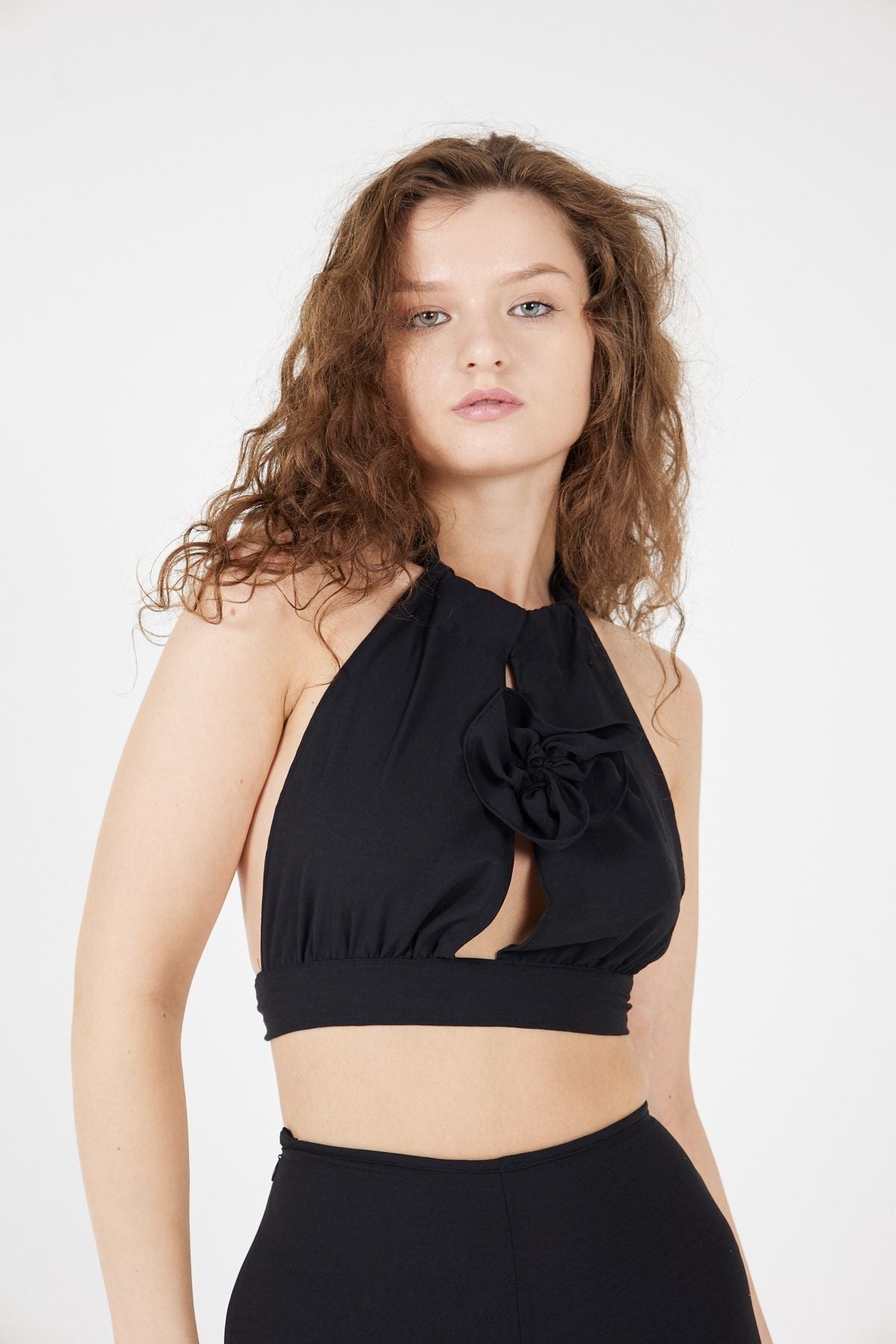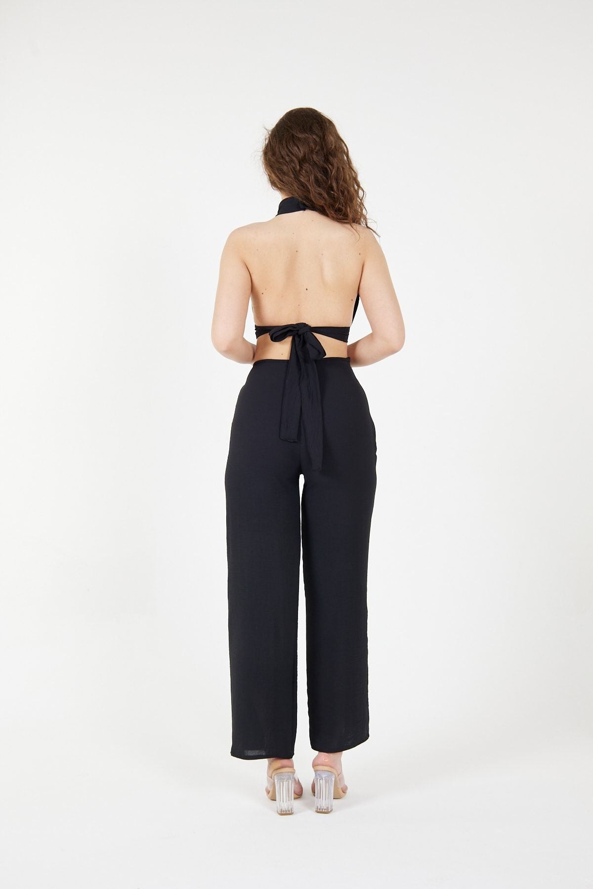 Dalia Siyah Palazzo Pantolon- Boyundan Bağlama Çiçekli Crop Kadın Takım