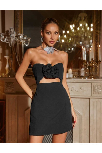 July Siyah Staplez Çiçek Detaylı Kadın Mini Elbise
