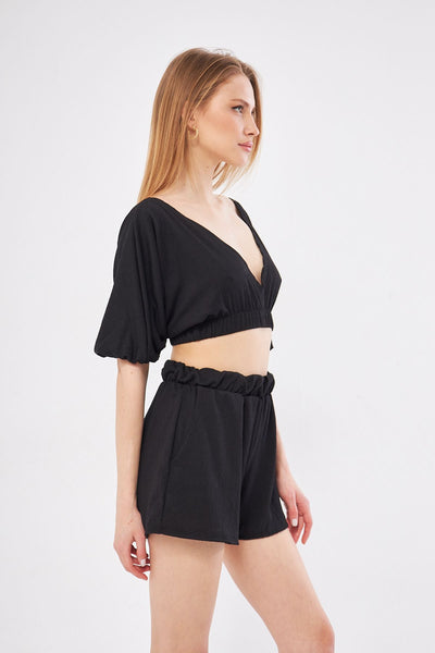 Liraz Siyah Balon Kol Alt Lastikli Crop- Lastikli Cepli Şort Kadın Takım