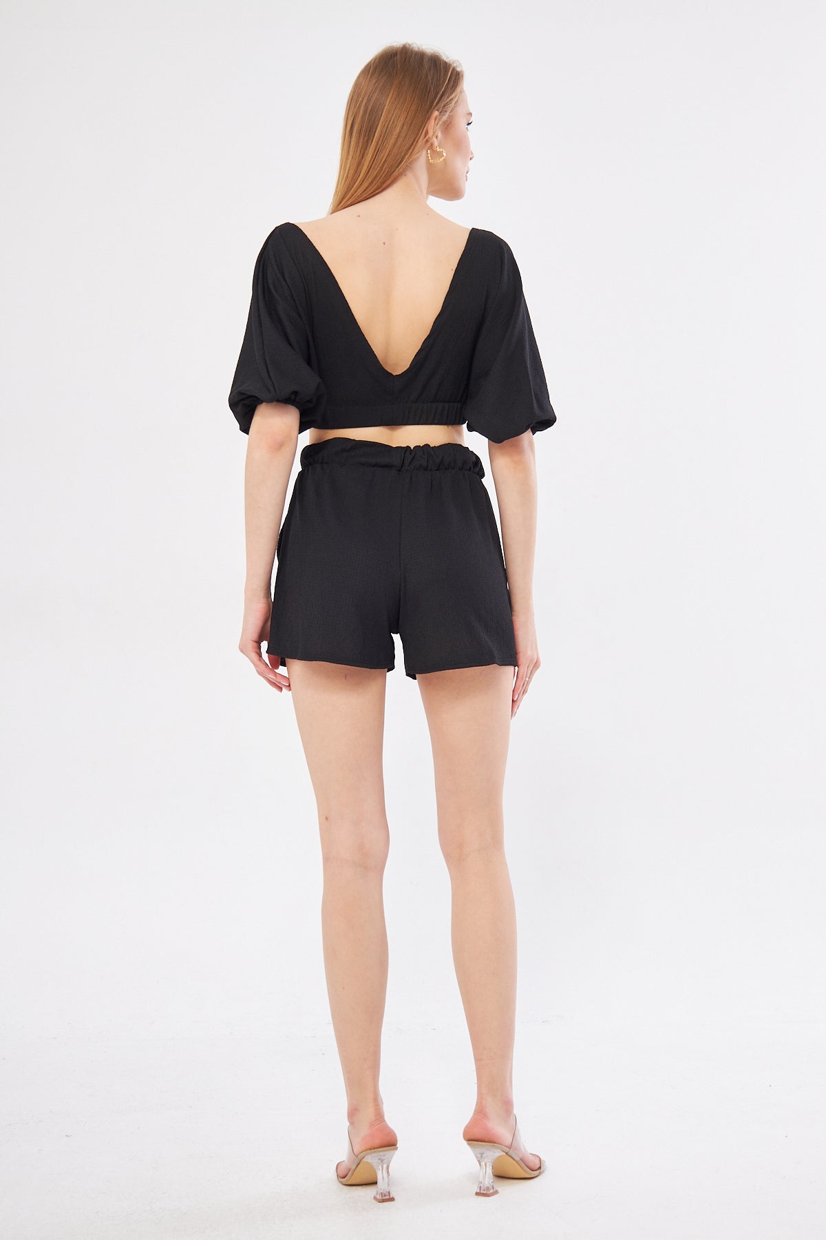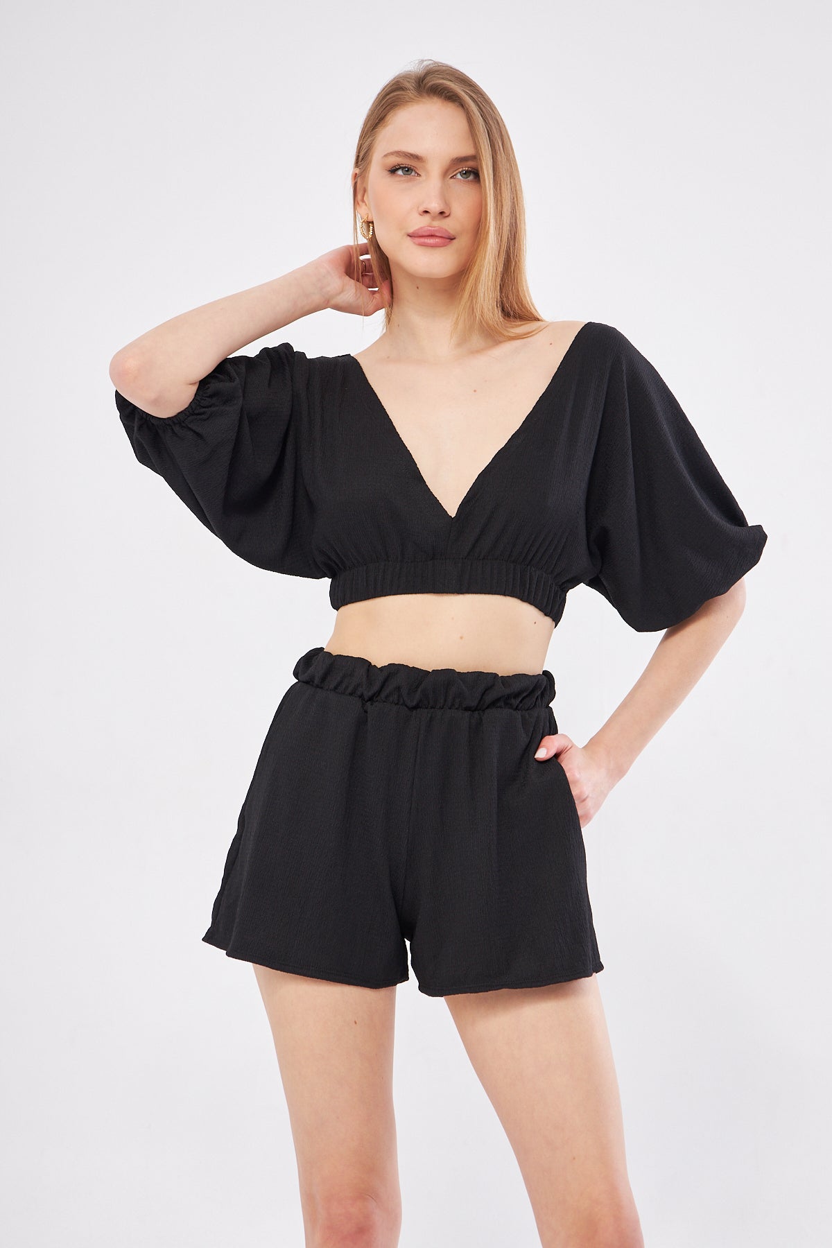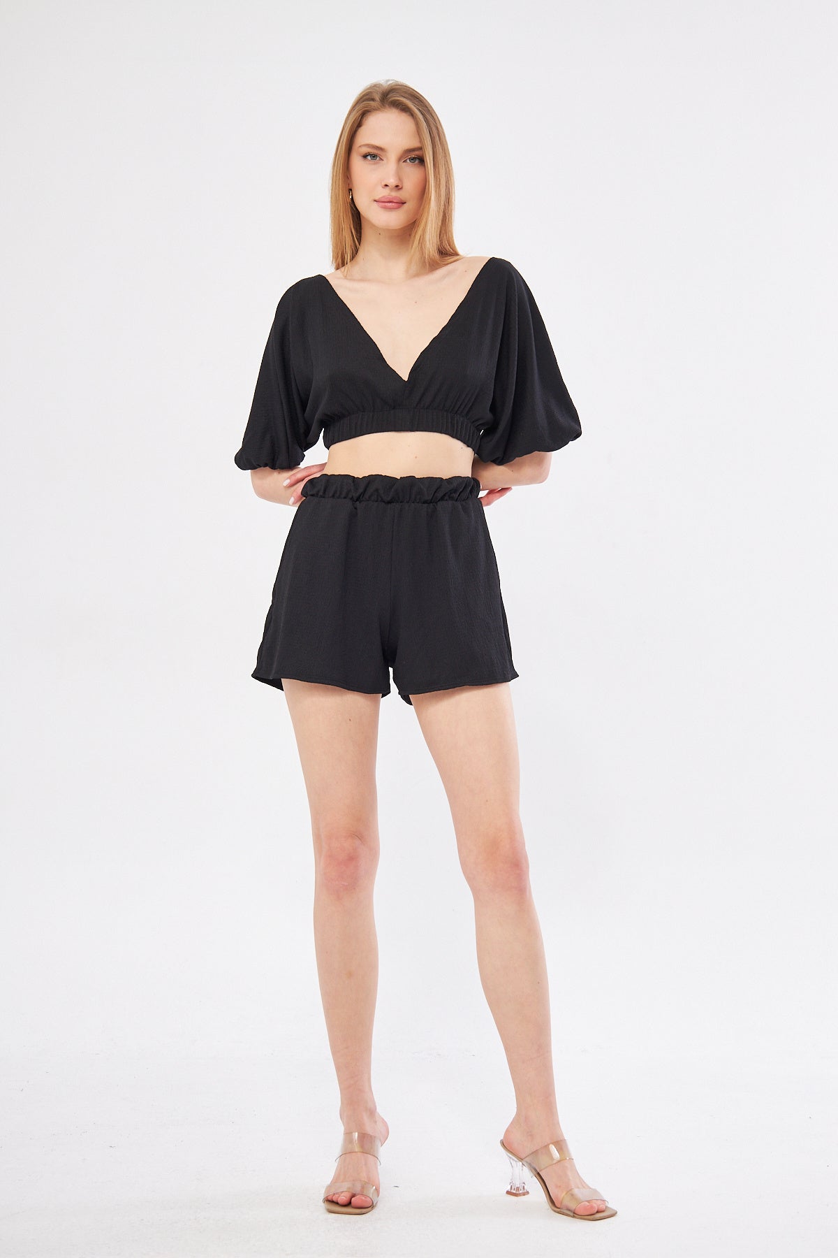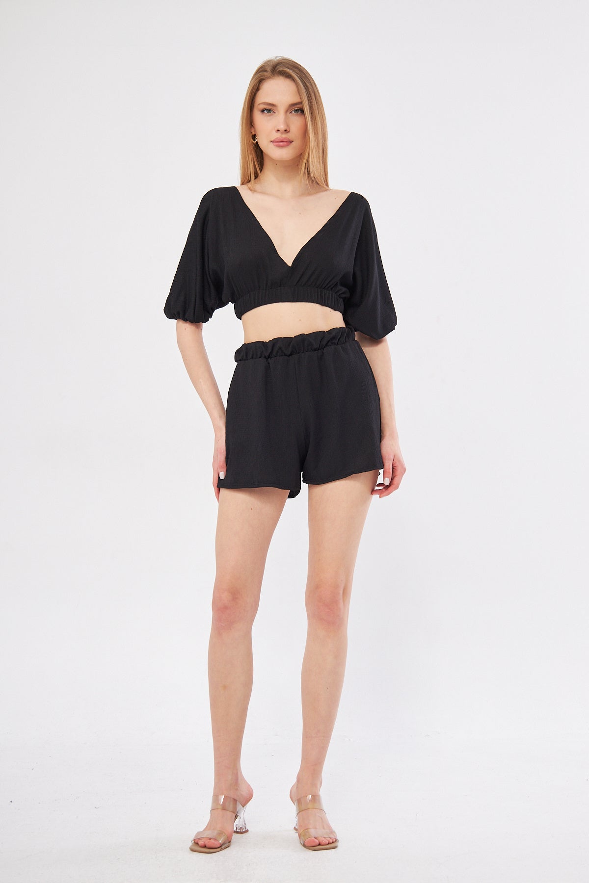 Liraz Siyah Balon Kol Alt Lastikli Crop- Lastikli Cepli Şort Kadın Takım
