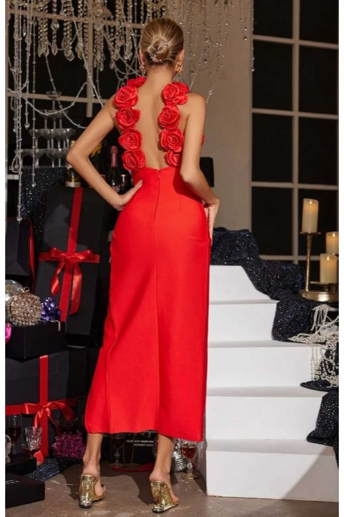 Hug Kırmızı Halter Çiçek Aplikli Kadın Midi Elbise